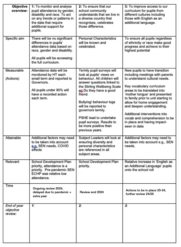 The school reviews and updates this statement annually and policy every 3 years. The school is committed to ensuring equality of provision throughout the school community. This years objectives are presented in the table below.