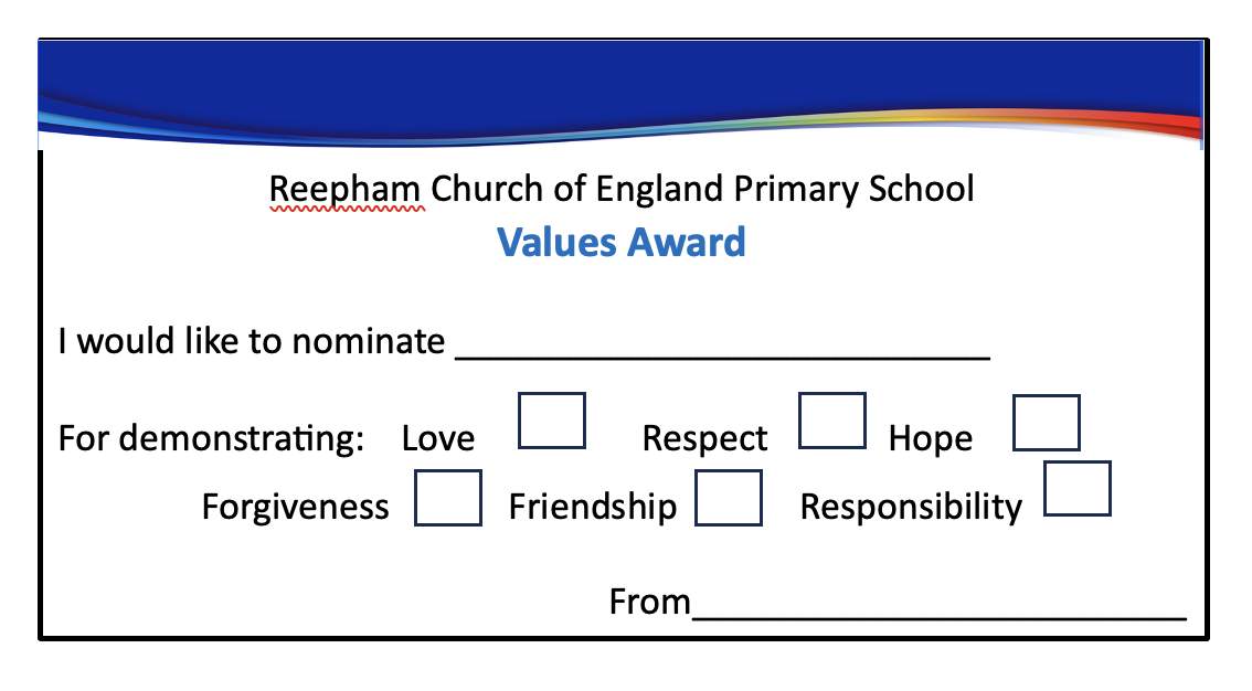 Our 'Values Award' is awarded to children who are seen demonstrating our Church School Values.